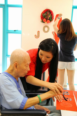 A group of Nanyang Management Institute students befriending with the aunties and uncles through writing couplets, making cards and singing.